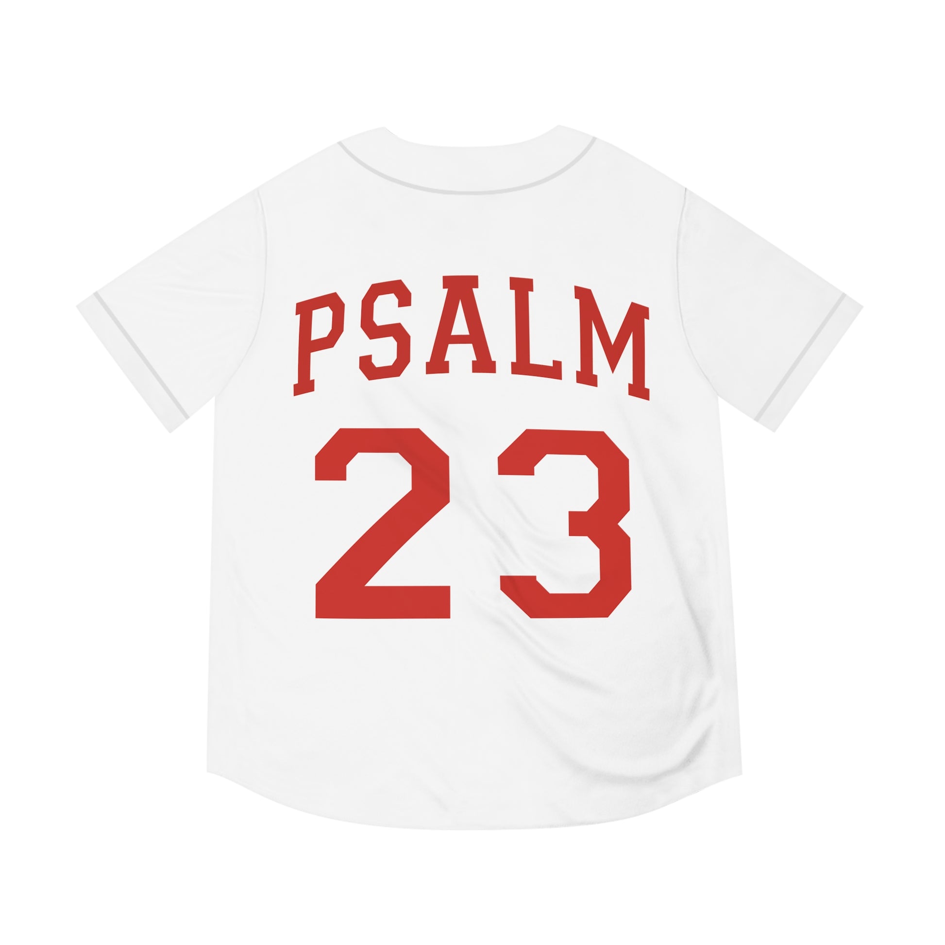 Lightweight baseball jersey with bold, vintage-inspired lettering that reads ‘PSALM 23’ across the back and a small, chest-offset version on the front. The extra-light, moisture-wicking polyester feels airy on warm days and moves with you during practice, church leagues, or casual weekends. Rounded hem and full-button front give it authentic ballpark form, while the sewn-in label and regular fit keep the look clean and effortless. Wear it as a statement of faith and comfort — it layers easily over tees or stands alone on game day.