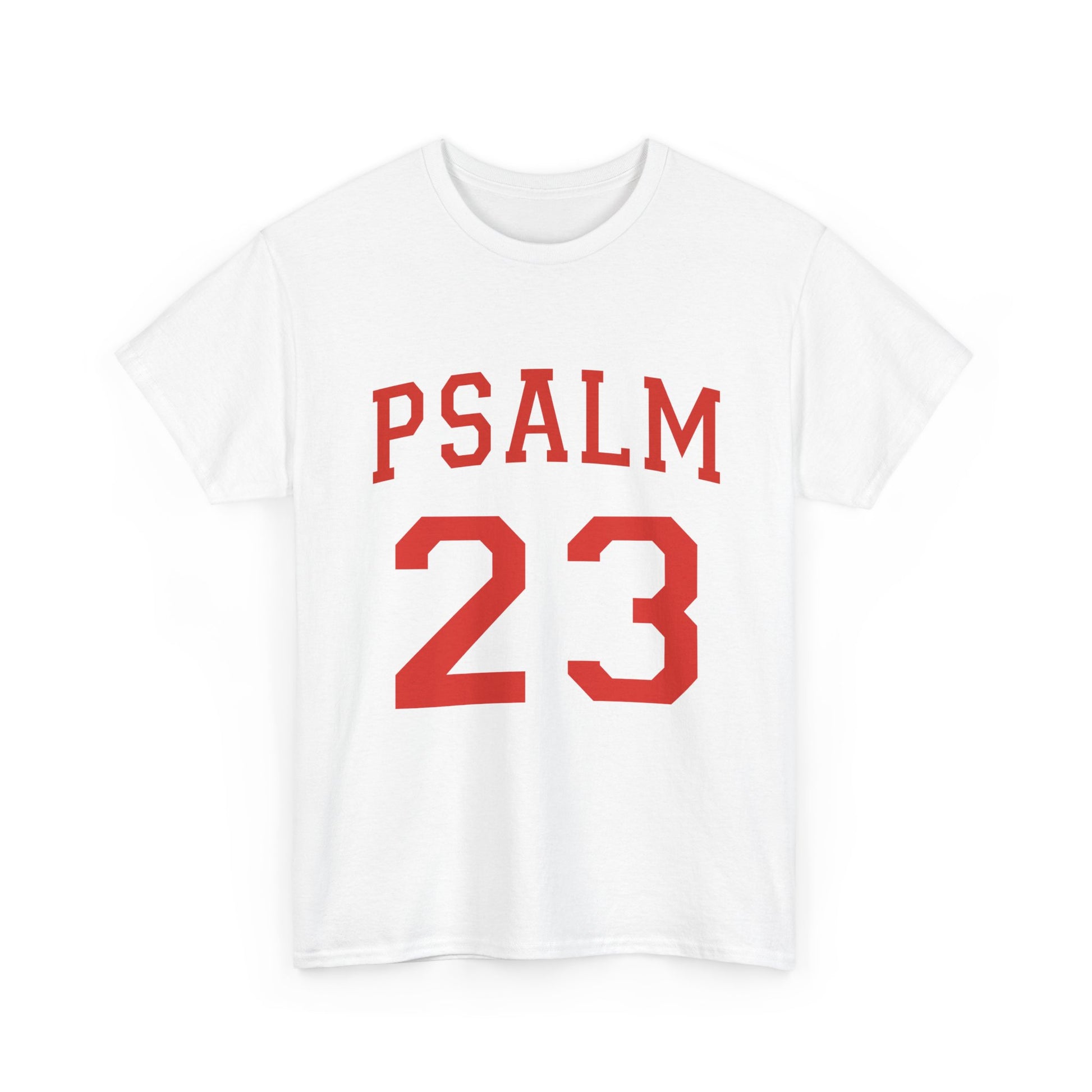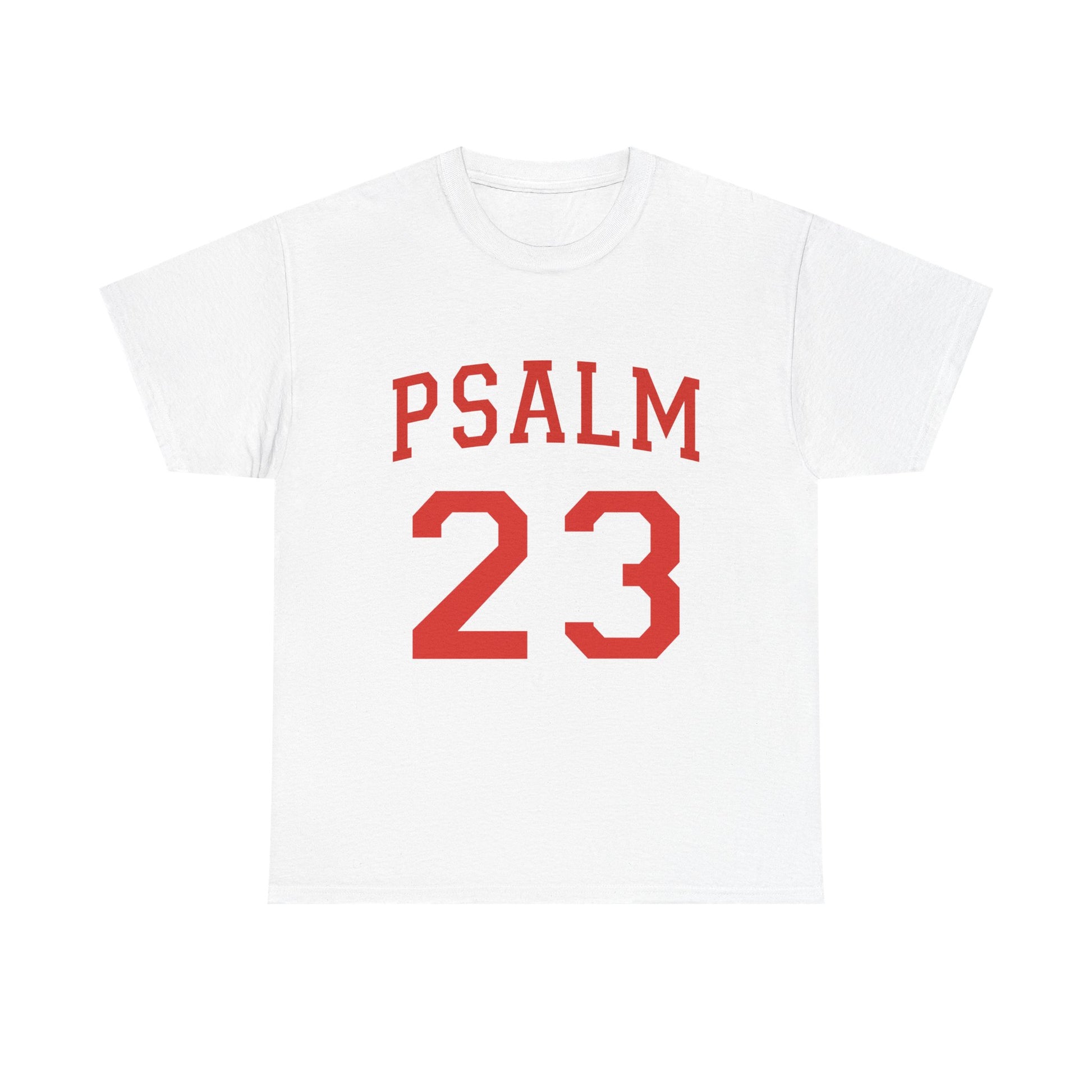 A soft, sturdy cotton tee that wears like a familiar hymn. The clean white canvas puts the bold, collegiate-style “PSALM 23” front and center — a quiet declaration of faith and comfort with vintage athletic energy. Lightweight but durable, it settles into the shoulders and chest without stretching, and the crew neckline keeps the silhouette tidy whether layered under a jacket or worn solo. This shirt moves from morning quiet time to neighborhood walks and casual church gatherings, carrying a calm confidence and an easy, lived-in feel.